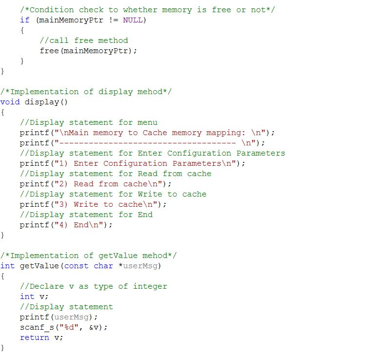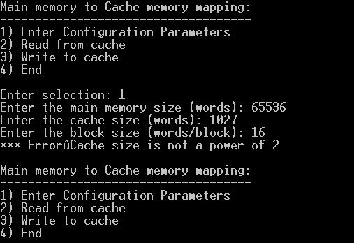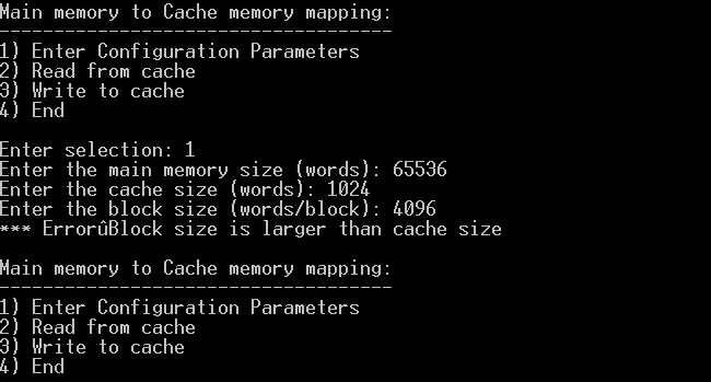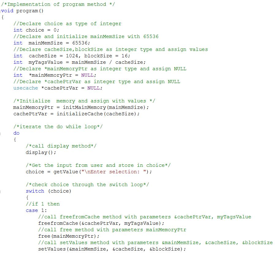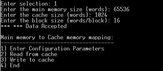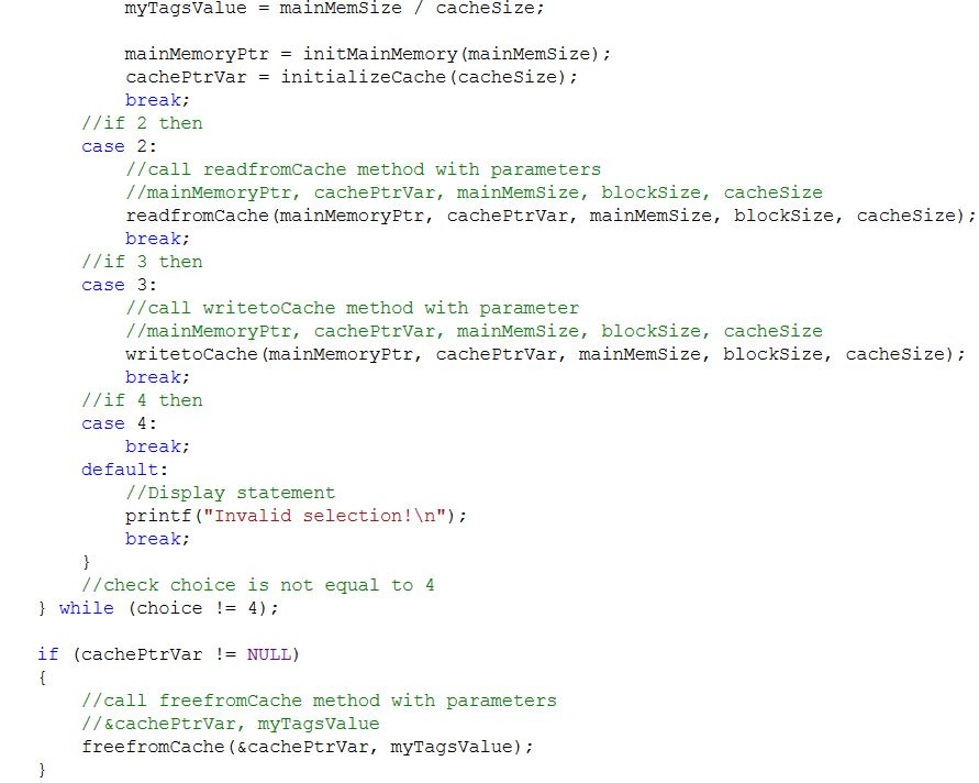 The program simulates reading from and writing to a cache based on choosing from a menu of choices, where each choice calls the appropriate procedure, where the choices are: