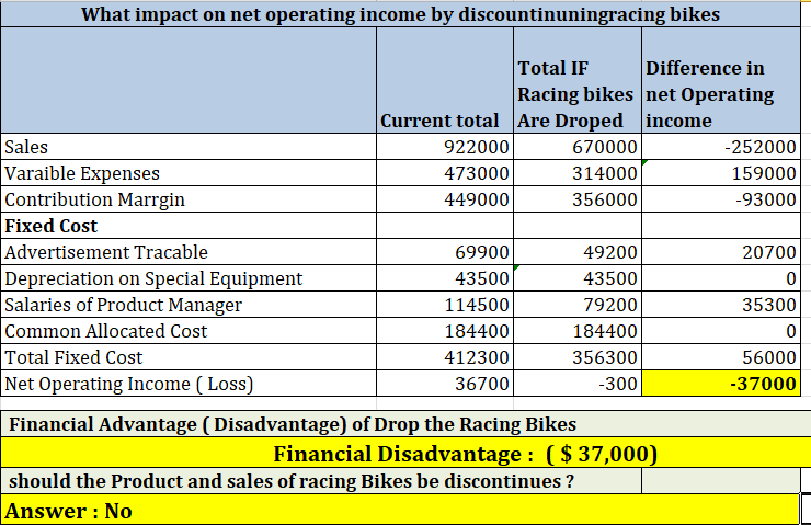 The Regal Cycle Company manufactures three types of bicycles—a dirt bike, a mountain bike, and a racing bike. Data on sales and expenses for the past quarter follow: Total Dirt Bikes Mountain Bikes Racing Bikes Sales $ 922,000 $ 266,000 $ 404,000 $ 252,000 Variable manufacturing and selling expenses 473,000 118,000 196,000 159,000 Contribution margin 449,000 148,000 208,000 93,000 Fixed expenses: Advertising, traceable 69,900 8,800 40,400 20,700 Depreciation of special equipment 43,500 20,500 7,800 15,200 Salaries of product-line managers 114,500 40,500 38,700 35,300 Allocated common fixed expenses* 184,400 53,200 80,800 50,400 Total fixed expenses 412,300 123,000 167,700 121,600 Net operating income (loss) $ 36,700 $ 25,000 $ 40,300 $ (28,600) *Allocated on the basis of sales dollars. Management is concerned about the continued losses shown by the racing bikes and wants a recommendation as to whether or not the line should be discontinued. The special equipment used to produce racing bikes has no resale value and does not wear out. Required: 1. What is the financial advantage (disadvantage) per quarter of discontinuing the racing bikes? 2. Should the production and sale of racing bikes be discontinued? 3. Prepare a properly formatted segmented income statement that would be more useful to management in assessing the long-run profitability of the various product lines.