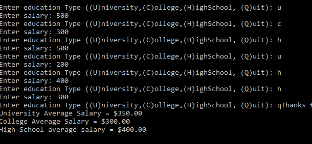 You have been approached by the Statistics Canada to create a C# program to calculate the average salary of people with university degrees, college diplomas, and high school diplomas. Using a while loop, you are to process salary data until the user indicates that you should stop (there could be 0 or more data values). For each person processed, the program must first input an education type (char edType) (‘U’ or ‘u’ for university degrees, ‘C’ or ‘c’ for college diplomas, and ‘H’ or ‘h’ for high school) and then a salary (double salaryData). The program stops accepting input when the user enters a ‘Q’ or ‘q’ for quit (use a sentinel value while loop). Your main data processing loop should be conditioned on the fact that the user has not signalled quit. It might look something like: