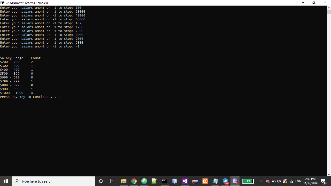 Console.Write("Enter your salars amont or -1 to stop: ");