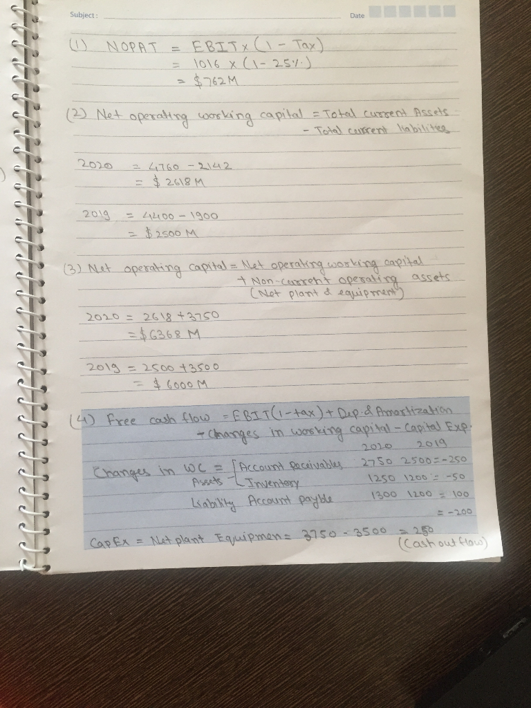 Millions of Dollars) 2020 2019 Sales $ 13,000 $ 11,000 Operating costs excluding depreciation 11,564 9,722 Depreciation and amortization 420 370 Earnings before interest and taxes $ 1,016 $ 908 Less interest 260 200 Pre-tax income $ 756 $ 708 Taxes (25%) 189 177 Net income available to common stockholders $ 567 $ 531 Common dividends $ 201 $ 200 Rhodes Corporation: Balance Sheets as of December 31 (Millions of Dollars) 2020 2019 Assets Cash $ 650 $ 600 Short-term investments 110 100 Accounts receivable 2,750 2,500 Inventories 1,250 1,200 Total current assets $ 4,760 $ 4,400 Net plant and equipment 3,750 3,500 Total assets $ 8,510 $ 7,900 Liabilities and Equity Accounts payable $ 1,300 $ 1,200 Accruals 650 600 Notes payable 192 100 Total current liabilities $ 2,142 $ 1,900 Long-term debt 1,300 1,200 Total liabilities $ 3,442 3,100 Common stock 3,502 3,600 Retained earnings 1,566 1,200 Total common equity $ 5,068 $ 4,800 Total liabilities and equity $ 8,510 $ 7,900 Suppose the federal-plus-state tax corporate tax is 25%. Answer the following questions. What is the net operating profit after taxes (NOPAT) for 2020? Enter your answer in millions. For example, an answer of $1 million should be entered as 1, not 1,000,000. Round your answer to the nearest whole number. $ million What are the amounts of net operating working capital for both years? Enter your answers in millions. For example, an answer of $1 million should be entered as 1, not 1,000,000. Round your answers to the nearest whole number. 2020: $ million 2019: $ million What are the amounts of total net operating capital for both years? Enter your answers in millions. For example, an answer of $1 million should be entered as 1, not 1,000,000. Round your answers to the nearest whole number. 2020: $ million 2019: $ million What is the free cash flow for 2020? Enter your answer in millions. For example, an answer of $1 million should be entered as 1, not 1,000,000. Cash outflow, if any, should be indicated by a minus sign. Round your answer to the nearest whole number. $ million What is the ROIC for 2020? Round your answer to two decimal places. % How much of the FCF did Rhodes use