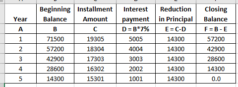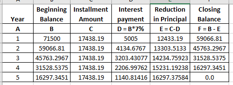 4.Amortization with Equal Payments [LO3] Prepare an amortization schedule for a five-year loan of $71,500. The interest rate is 7 percent per year, and the loan calls for equal annual payments. How much interest is paid in the third year? How much total interest is paid over the life of the loan?