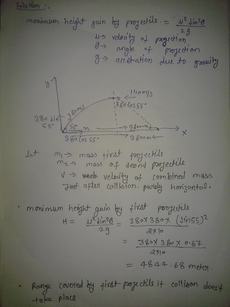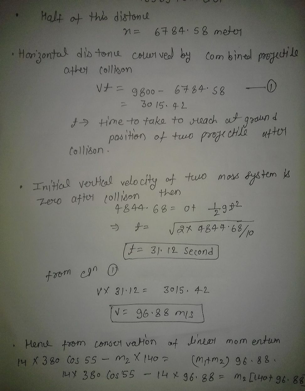 A 14 kg projectile is launched at 380 m/s at a 55 ∘ angle to the horizontal. At the peak of its trajectory it collides with a second projectile moving horizontally, in the opposite direction, at 140 m/s . The two stick together and land 9.8 km horizontally downrange from the first projectile's launch point.