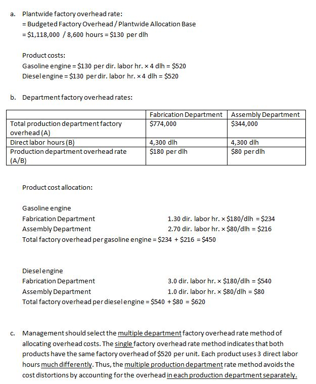 b. Determine the per-unit factory overhead allocated to the gasoline and diesel engines under the multiple production department factory overhead rate method, using direct labor hours as the activity base for each department.