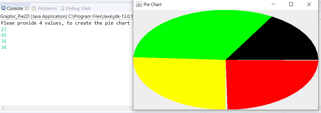 JAVA - Write a program that prompts the user (at the command line) for 4 positive integers, then draws a pie chart in a window. Convert the numbers to percentages of the numbers’ total sum; color each segment differently; use Arc2D. No text fields (other than the window title) are required. Provide a driver in a separate source file to test your class.