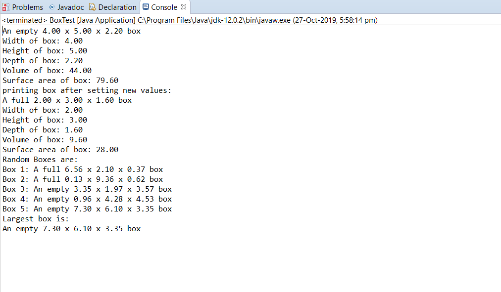Design and implement a class called Boxthat represents a 3-dimensional box.1.Instance DataYour Box class will need variables to store the size of the box. All of these variables will be of type ‘private double’.•width•height•depthYour Boxclass will also need a variable to keep track of whether or not the box is full. This will be of type ‘private boolean’.•full2.ConstructorDeclaration: public Box( double width, double height, double depth)•Your Boxconstructor will accept the width, height,and depthof the box.•In your constructor, initialize the width, height,and depthinstance variables to values passed in as parameters to the constructor.•Each newly created box will be empty. This means that you will also need to initialize fullto false in your constructor.3.Getter and Setter MethodsInclude getter and setter methods for all instance data. We will assume that all supplied dimension values are positive values. Here is an example of the method declarations for width to get you started.•Getter: public double getWidth()•Setter: public void setWidth(double width)4.Public Methods•Write a public double volume()method that will calculate and return the volume of the box based on the instance data values.•Write a public double surfaceArea()method that will calculate and return the surface area of the box based on the instance data values.5.toString MethodWrite apublic String toString() method that returns a one-line description of the box. The description should provide its dimensions and whether or not the box is full. Format all double values to 2 decimal places.Example: An empty 4.00x 5.00 x 2.00 box.Part 2: Testing your ClassNow, create a driver class called BoxTestand do the following in the main method.Create your first box1.Create a Boxvariable called smallBoxand instantiate it with width 4, height 5, and depth 2.2.Print the one-line description of smallBoxusing its toString()method.3.Confirm that smallBox’s width, height, and depth getter methods are returning the correct values.4.Confirm that smallBox’s volume()and surfaceArea()methods are returning the correct values.5.Use smallBox’s setter methods to change it from “empty” to “full” and to change its dimension values to width 2, height 3, and depth 1.6.Print the one-line description of smallBoxusing toString()again, and confirm that all changed values are reflected.7.Confirm that all getter and other methods return the correct values reflecting smallBox’s current dimensions and full value.Create several boxes and find the largest oneDo not delete what you did above! Add the following code to the end of your BoxTestclass.1.Declare and instantiate an ArrayListobject that will store your Boxobjects.See the listing below as a sample of how to use the ArrayListbut with Stringobjects.2.In a standard “for” loop that iterates 5 times, create a new Boxwith randomly generated width, height, and depth and add the box to your ArrayList. Limit dimension values to a reasonable range. Randomly generate a Boolean value and use it to call the Box’s method for setting “full” (use the nextBoolean()method in the Randomclass).3.In the loop, print outthe Box’s details, labeled according to the loop iteration (i.e. if this isthe first iteration of the loop, label the box as “Box 1: “ in the output).4.Use a for-each loop(as shown in the listing above)to find the Boxwith the largest volume. You will need to declare a largest box variable of type Boxto keep track of the largest box. This variable needs to be declared outside of the loop so that it will still be available when the loop ends. Use conditional statements inside the loop to compare the current Box to the largest Box, so far, and update the largest box variable when appropriate.5.After the loop, print the details of the largest Box. Confirm that you program identified the correct boxes.