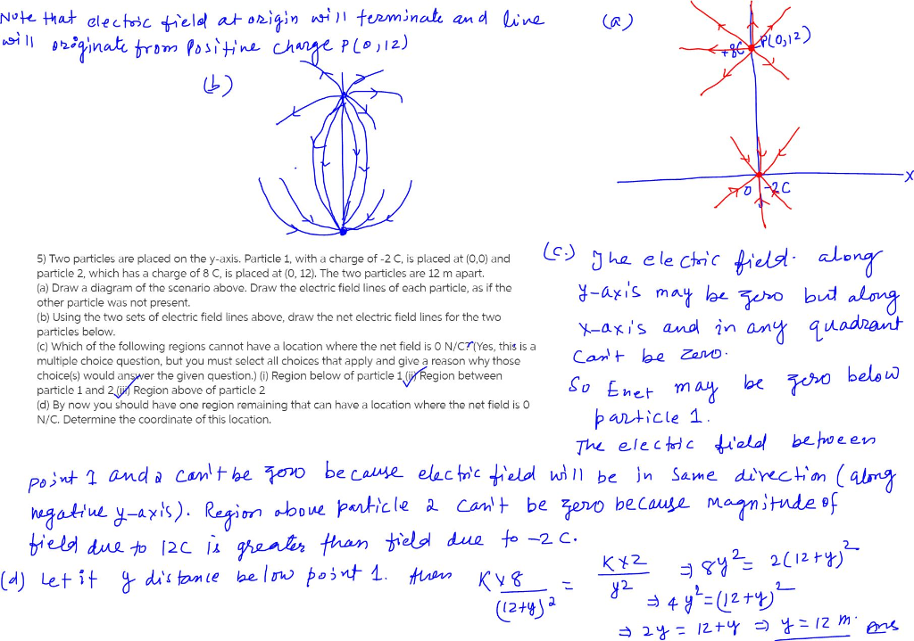 5) Two particles are placed on the y-axis. Particle 1, with a charge of -2 C, is placed at (0,0) and particle 2, which has a charge of 8 C, is placed at (0, 12). The two particles are 12 m apart.