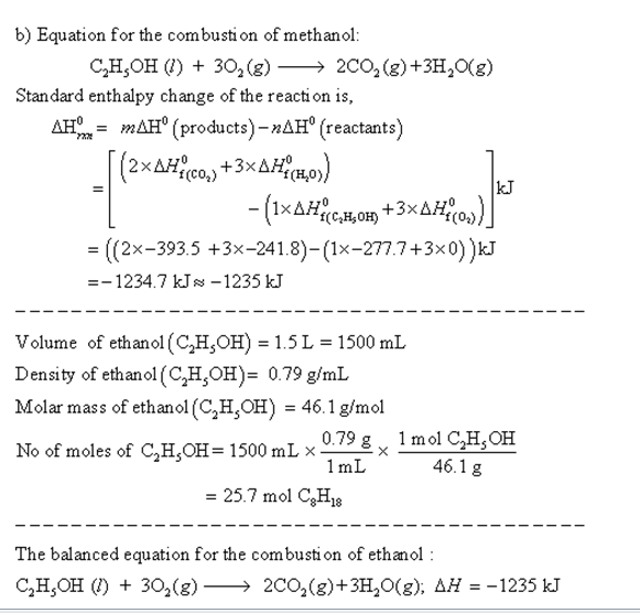 B)By using the information given as well as data in Appendix C, compare the energy produced by combustion of 2.0 L of ethanol. Consider that water is in the gaseous state.
