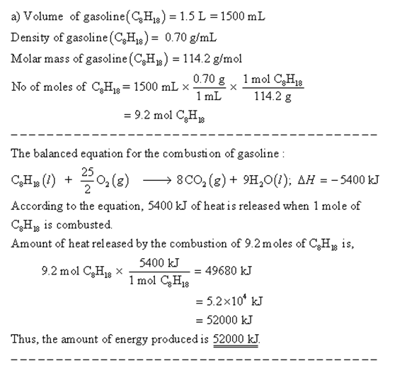 A)By using the information given as well as data in Appendix C, calculate the energy produced by combustion of 2.0 L of gasoline