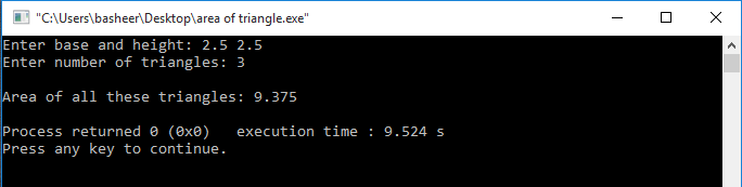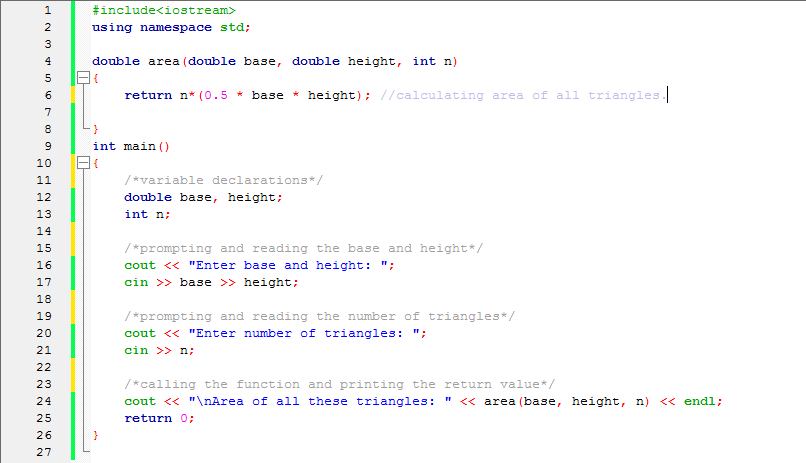 1. write a c++ function that received two doubles that represent the sides of a triangle and an integer that represents the number of triangles of that size. calculate the area of all these triangles. remember area of a triangle is ahalf base times width. and return this value as a double.