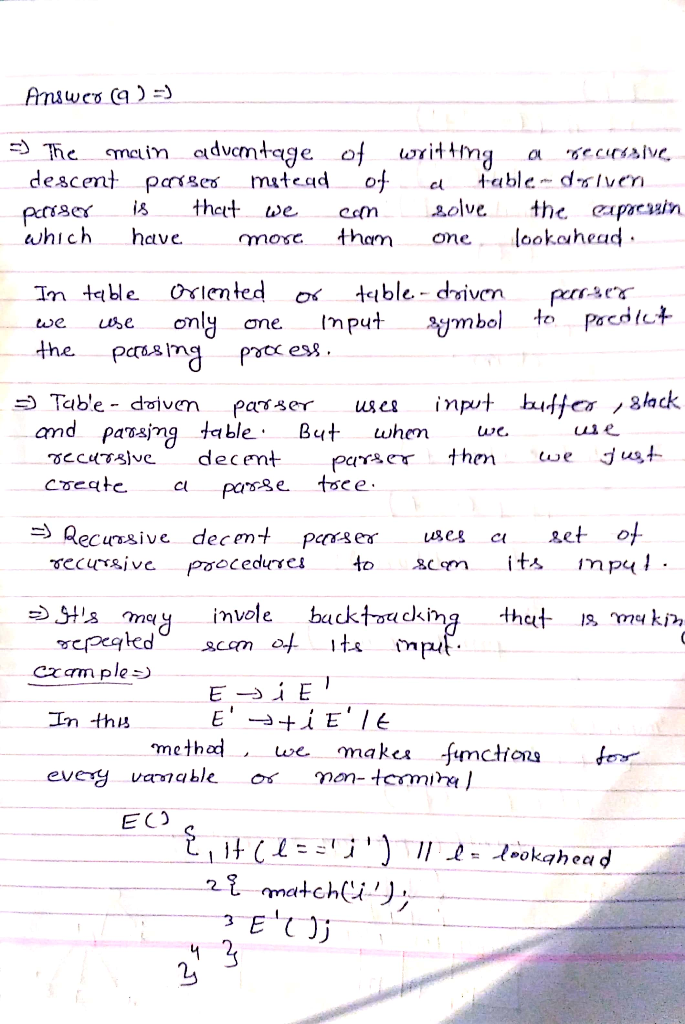 a.What are the advantages of writing a recursive descent parser instead of a table-driven parser?