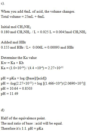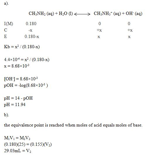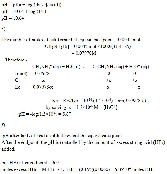 Consider the titration of a 25.0 −mL sample of 0.180 M CH3NH2 with 0.155 M HBr. Determine each of the following.