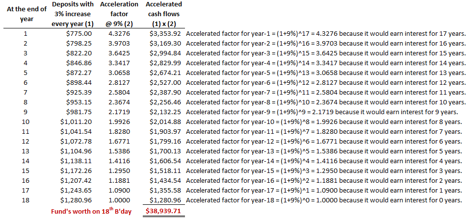 A new father plans on saving for his daughter’s college education. He will donate $775.00 on her first birthday. After that, he will increase his donation by 3.00% each year and will make his last contribution on her 18th birthday. If he can earn 9.00% each year in his investment account, how much will his daughter’s college fund be worth on her 18th birthday?