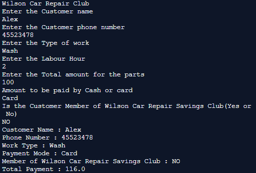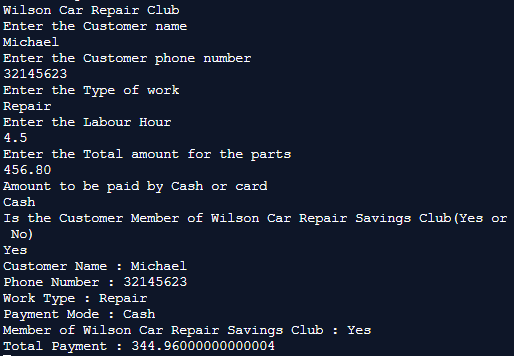System.out.println("Member of Wilson Car Repair Savings Club : "+club_member);