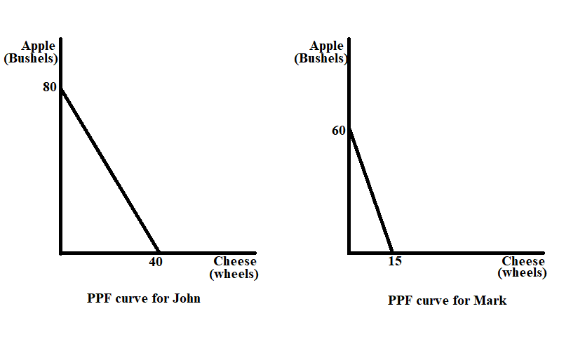 Above is a situation that depicts PPF curve of John and Mark. Here, it is observed that John is producing more apples or more cheese than that of Mark. It shows higher efficiency level of John in comparison to that of Mark. So, John holds absolute advantage in producing both of Apple and Cheese over Mark.