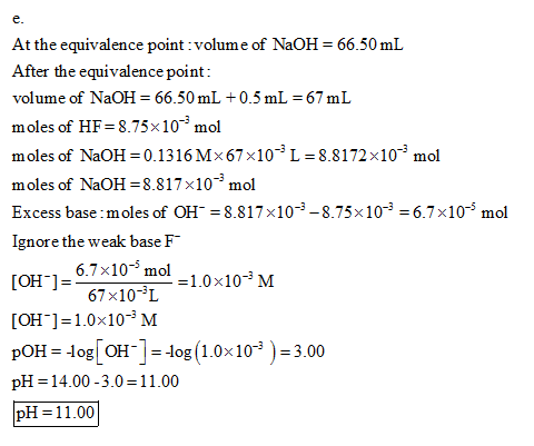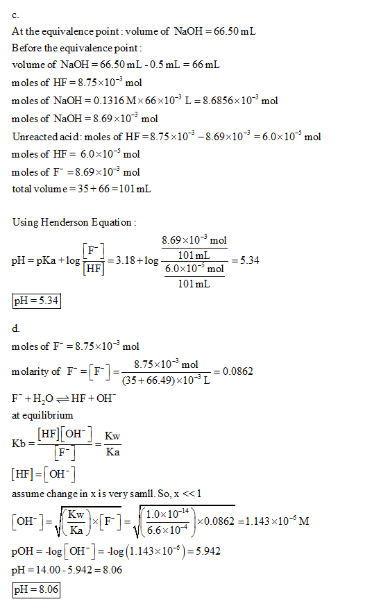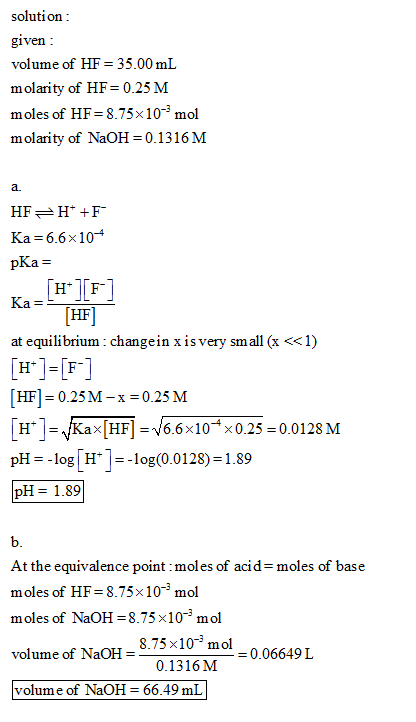 A 35.00 mL solution of 0.25M HF is titrated with a standardized 0.1316M solution of NaOH at 25C.