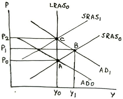 In following graph, when money supply increases, AD curve will shift rightward from AD1 to AD2, intersecting SRAS1 at point E2 with higher price level P2 and higher real GDP Y2, with inflationary gap being equal to (Y2 - Y1) in short run. In long run, SRAS1 shifts left to SRAS2, intersecting AD2 at point E3 with further higher price level P3 and restoring real GDP to potential GDP level Y1, removing the short-run inflationary gap.