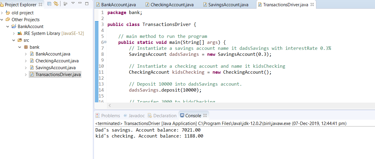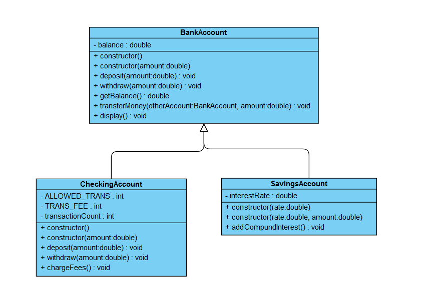 Also, draw the inheritance UML diagram for the three bank accounts classes.