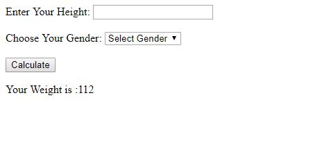 According to researchers at Stanford Medical School (as cited in Medical Self Care), the ideal weight for a woman is found by multiplying her height in inches by 3.5 and subtracting 108. The ideal weight for a man is found by multiplying his height in inches by 4 and subtracting 128. Using PHP and HTML 5, design and build a web page that calculates the ideal weight given the person’s gender and height. The user selects the gender from a drop down list and enters the height in a text box. Your PHP script should read all the input and calculate and display the ideal weight.