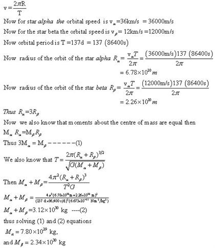 The two stars in a certain binary star system move in circular orbits. The first star, Alpha, has an orbital speed of 36.0km/s. The second star, Beta, has an orbital speed of 12.0km/s. The orbital period is 137d.