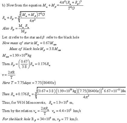 One of the best candidates for a black hole is found in the binary system called A0620-0090. The two objects in the binary system are an orange star, V616 Monocerotis, and a compact object believed to be a black hole. The orbital period of A0620-0090 is 7.75hours, the mass of V616 Monocerotis is estimated to be 0.67 times the mass of the sun, and the mass of the black hole is estimated to be 3.8times the mass of the sun. Assuming that the orbits are circular, find the radius of the orbit of the orange star.