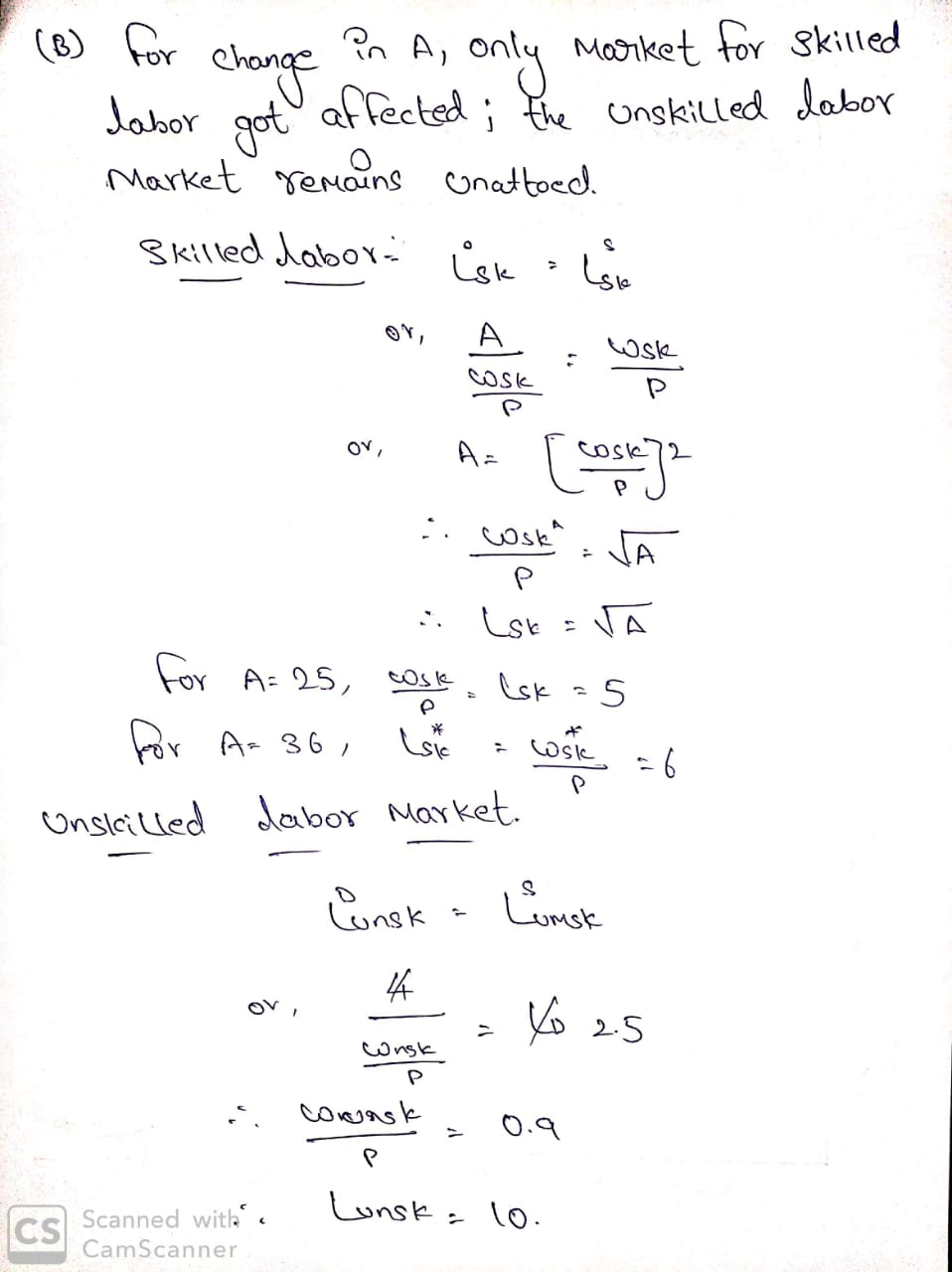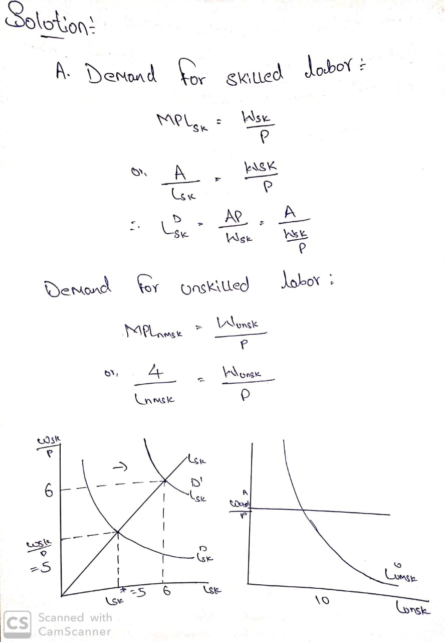 (A) Derive the demand functions for skilled and unskilled labor, LDsk and LDunsk. Sketch the equilibrium graphically on two diagrams: the market for skilled labor and the market for unskilled labor. Don’t worry about the precise shape of the curves.