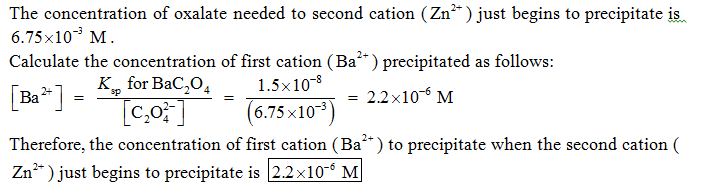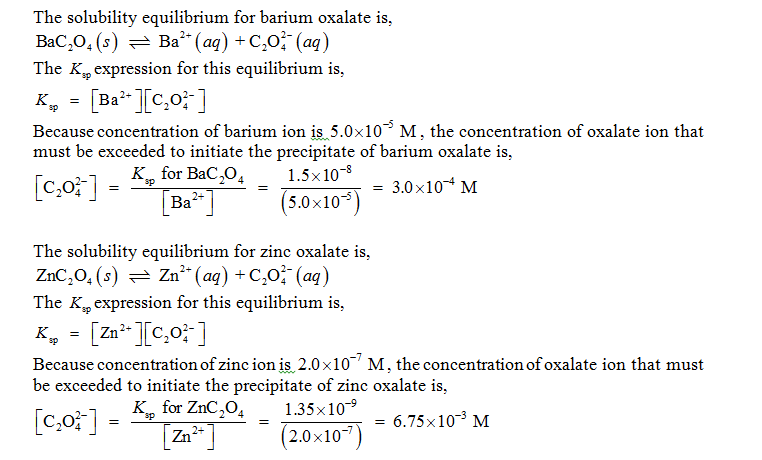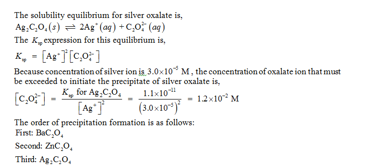 A solution contains [Ba2+] = 5.0 × 10-5 M, [Ag+] = 3.0 × 10-5 M, and [Zn2+] = 2.0 × 10-7 M. Sodium oxalate is slowly added so that [C2O42-] increases. Salt BaC2O4 ZnC2O4 Ag2C2O4 Ksp 1.5 × 10-8 1.35 × 10-9 1.1 × 10-11 What is the concentration of the first cation to precipitate when the second cation just begins to precipitate?