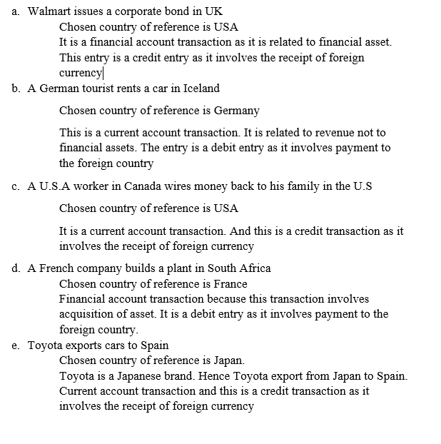Classify the following transactions (current account transaction, financial account transaction), the sign of entry (plus or minus/ debit or credit). Choose one country of reference.