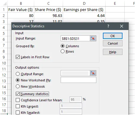 Step 3: Select Input Y Range: 'Share Price' column, Input X Range: 'Fair value' column then OK. The screenshot is shown below,