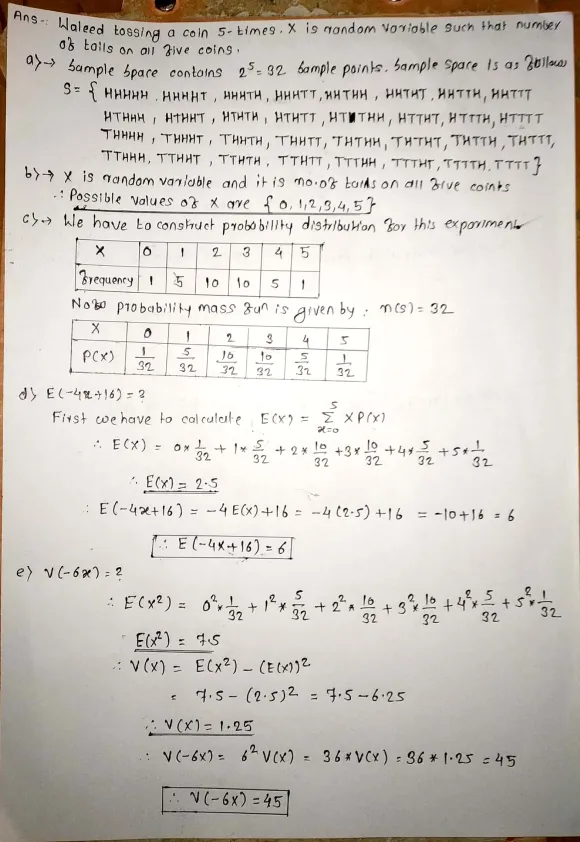 Waleed decided to construct a probability distribution of tossing five coins. He considers his random variable ?, to be the number of Tails on all five coins.