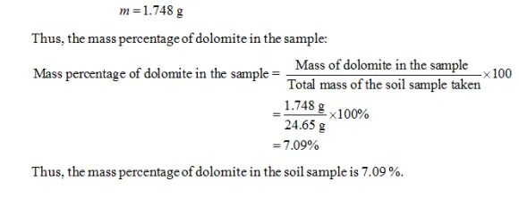 Dolomite, [CaMg(CO3)2] is found in a soil sample. A geochemist titrates 24.65 g of soil with 57.85 mL of 0.3315M HCl. What is the mass % of dolomite in the soil? ( Write answer to two decimal places, ex. 15.77) Following is the acid/base reaction which occurs during the titration: CO3-2(aq) + HCl(aq) --> HCO3-(aq) + Cl-(aq)