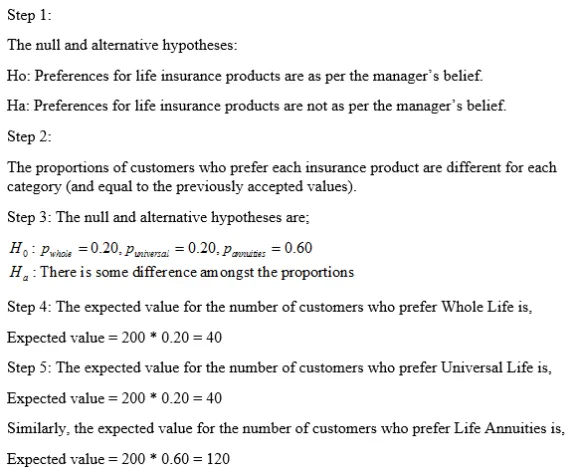 A manager for an insurance company believes that customers have the following preferences for life insurance products: 20% prefer Whole Life, 20% prefer Universal Life, and 60% prefer Life Annuities. The results of a survey of 200 customers were tabulated. Is it possible to refute the sales manager's claimed proportions of customers who prefer each product using the data?