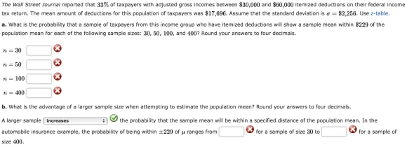 a. What is the probability that a sample of taxpayers from this income group who have itemized deductions will show a sample mean within $229 of the population mean for each of the following sample sizes: 30, 50, 100, and 400? Round your answers to four decimals.