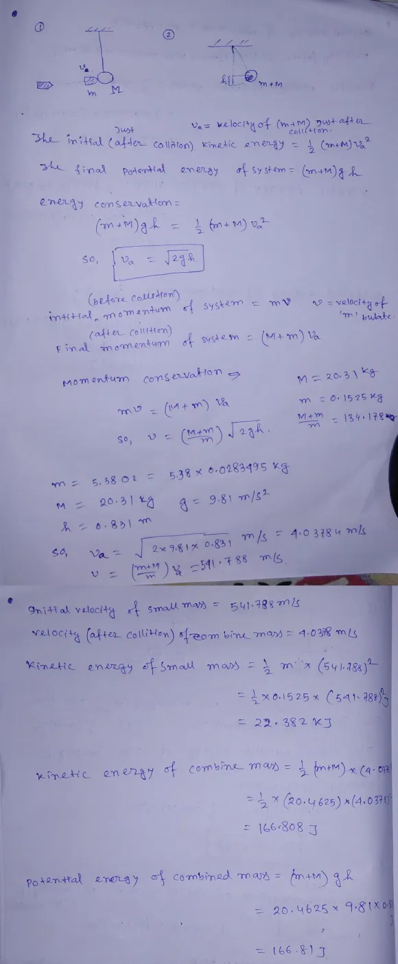 A ballistic with mass of m=5.38-Oz was fired towards a Ballistic Pendulum at initial velocity of υ into a large block of wood with mass of M=20.31_kg. As a result of the collision the pendulum and the projectile together swung up to the maximum height h = 0.831_m at a velocity of υb. Find a) υb velocity soon after impact, b) initial velocity υa , c) KE of the small mass, d) KE of the combined mass, e) PE of combined mass at hmax. 1_Oz = 0.0283495_kg.