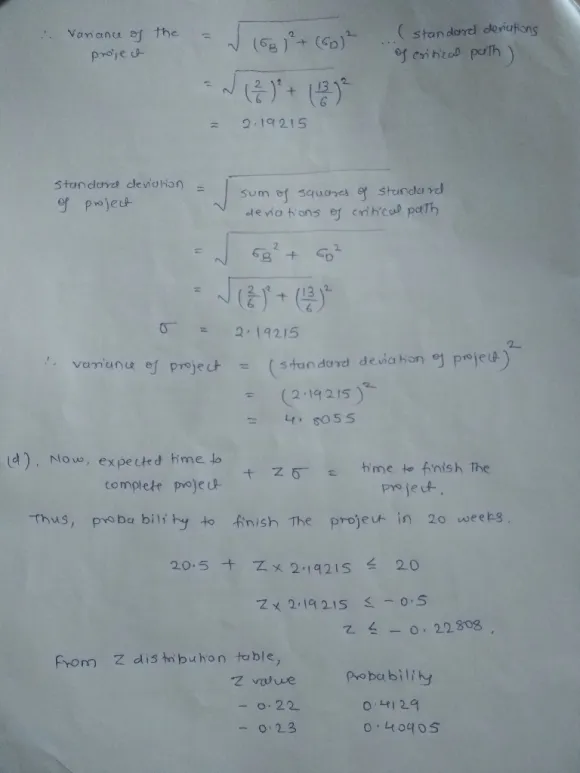 C. According to the table there are four activities in the project. Assume the normal distribution is appropriate to use to determine the probability of finishing by a particular time. If you wished to find the probability of finishing the project in 21 weeks or fewer. It would be necessary to find the variance and then the standard deviation to be used with the normal distribution. What variance and standard deviation would be used?