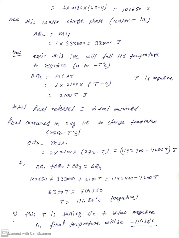 A piece of ice having a mass of 2 kg and an initial temperature of −272 ℃ (very cold!) is dropped into a container of water at 25 °C. Remember that: The specific heat of water is ?? = 4186 ? ??℃ , The specific heat of ice is 2100 ? ??℃ The latent heat of fusion for water is ?? = 333000 ? ?? .