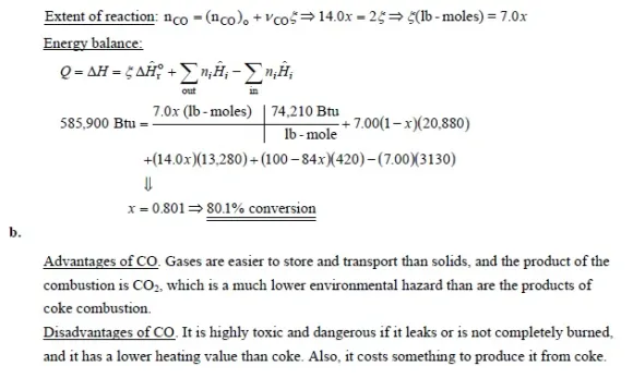 Coke can be converted into CO�a fuel gas�in the reaction CO2 (g) + C (s) ? 2 CO (g) a coke that contains 84% carbon by mass and the balance noncombustible ash is fed to a reactor with a stoichiometric amount of CO2. The coke is fed at 77�F, and the CO2 enters at 400�F. Heat is transferred to the reactor in the amount of 5859 Btu/lbm coke fed, the gaseous products and the solid reactor effluent (the ash and unburned carbon) leave the reactor at 1830�F. The heat capacity of the solid is 0.24 Btu/(lbm?�F). (a) Calculate the percentage conversion of the carbon in the coke. (b) The carbon monoxide produced in this manner can be used as a fuel for residential home heating as can the coke. Speculate on the advantages and disadvantages of using the gas.