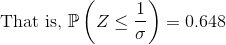 Looking up the Z table, we get P(Z < z) = 0.648 occurs at z = 0.38. Hence,
