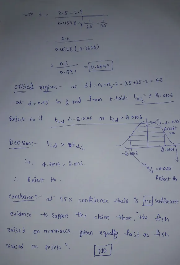 A researcher in aquaculture (fish farming) is interested in whether fish fed on minnows or fish raised on food pellets gain weight faster. A number of fish are randomly assigned to being fed minnows or food pellets. Assume that the data is normally distributed. Sample data is as follows: Sample A (minnows): Mean weight = 3.5 lbs s = 0.5 lbs. n = 25 Sample B (pellets): Mean weight = 2.9 lbs s = 0.4 lbs n = 25 Perform a hypothesis test at 95% confidence, to determine whether the two populations grow at the same rate. To get full credit, state your null and alternate hypotheses, show your test statistic, show your critical region, and state your conclusion: do fish raised on minnows grow equally fast as fish raised on pellets? YES or NO
