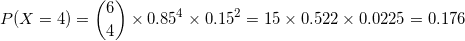 Substituting , n = 6, X = 4, p = 0.85 in the above, q =1 - p = 1 - 0.85 = 0.15
