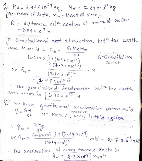 4. The centers of the moon and the Earth are separated by 3.84 x 108 m. The moon has a mass of 7.34 x 1022 kg. The mass of the earth is 5.97 x 1024 kg.