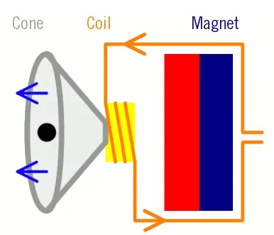 Working:- At the front of a loudspeaker, there is a fabric, plastic, paper, or lightweight metal cone a diaphragm not unlike a drum skin (colored gray in our picture). The outer part of the cone is fastened to the outer part of the loudspeaker's circular metal rim. The inner part is fixed to an iron coil a.k.a the voice coil, (colored orange in the diagram) that sits just in front of a permanent magnet(sometimes called the field magnet, and colored yellow). When you hook up the loudspeaker to a stereo, electrical signals feed through the speaker cables (red) into the coil. This turns the coil into a temporary magnet or electromagnet. As the electricity flows back and forth in the cables, the electromagnet either attracts or repels the permanent magnet. This moves the coil back and forward, pulling and pushing the loudspeaker cone. Like a drum skin vibrating back and forth, the moving cone pumps sounds out into the air.