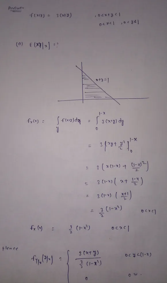 For f(x,y)=cxy, ? ≥ 0, ? ≥ 0, ? + ? ≤ 1, Determine E(Y|x) and E(X|y)