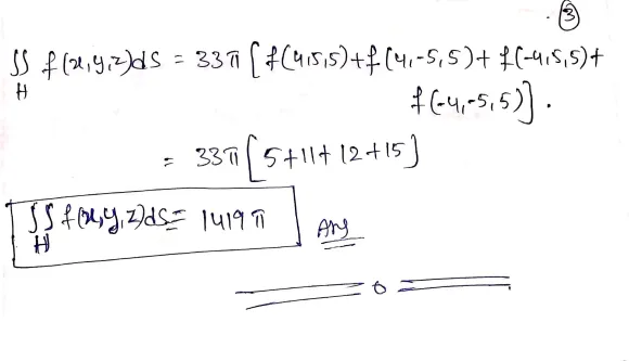 Let H be the hemisphere x2 + y2 + z2 = 66, z ≥ 0, and suppose f is a continuous function with f(4, 5, 5) = 5, f(4, −5, 5) = 11, f(−4, 5, 5) = 12, and f(−4, −5, 5) = 15. By dividing H into four patches, estimate the value below. (Round your answer to the nearest whole number.) H f(x, y, z) dS