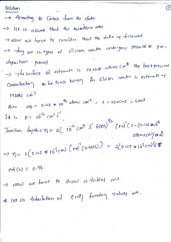 An n-type silicon wafer undergoes a pre-deposition diffusion process with a constant surface concentration of boride gas; the resulting concentration of boron in silicon at the surface is estimated to be 1x1018 atoms cm-3. The background concentration of trace boron atoms in the silicon wafer is estimated to be 1x1014 cm-3. (A) Estimate the depth of the p-n junction below the surface when the background doping concentration of the n-type impurity is 3.45 x1016 cm-3; assume the diffusion process proceeds for 10 minutes and has a diffusion parameter given by 10-12 cm2 s -1. (B) Estimate the number of boron atoms (per cm^2) introduced in this thin surface layer following the pre-deposition step.