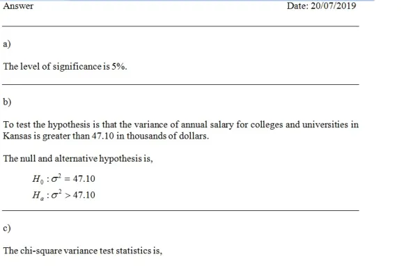 The following problem is based on information taken from Academe, Bulletin of the American Association of University Professors. Let x represent the average annual salary of college and university professors (in thousands of dollars) in the United States. For all colleges and universities in the United States, the population variance of x is approximately σ2 = 47.1. However, a random sample of 18 colleges and universities in Kansas showed that x has a sample variance s2 = 84.7. Use a 5% level of significance to test the claim that the variance for colleges and universities in Kansas is greater than 47.1.