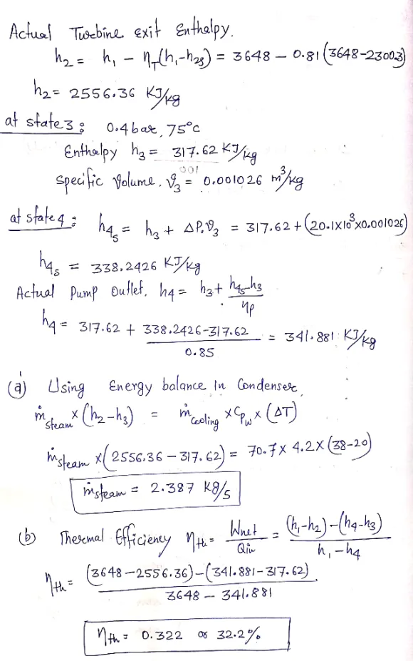 Superheated steam at 20 MPa, 640°C enters the turbine of a vapor power plant. The pressure at the exit of the turbine is 0.5 bar, and liquid leaves the condenser at 0.4 bar at 75°C. The pressure is increased to 20.1 MPa across the pump. The turbine and pump have isentropic efficiencies of 81 and 85%, respectively. Cooling water enters the condenser at 20°C with a mass flow rate of 70.7 kg/s and exits the condenser at 38°C. For the cycle, determine: (a) the mass flow rate of steam, in kg/s. (b) the percent thermal efficiency.