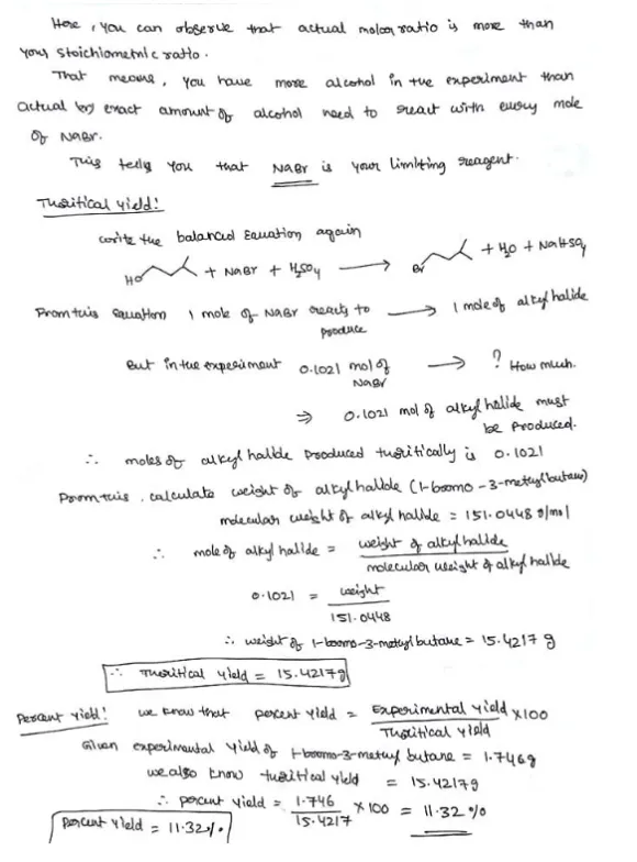 Actual molar ratio = moles of alcohol / moles of NaBr = 0.2155 / 0.1021 = 2.11 mol alcohol / 1 mol NaBr
