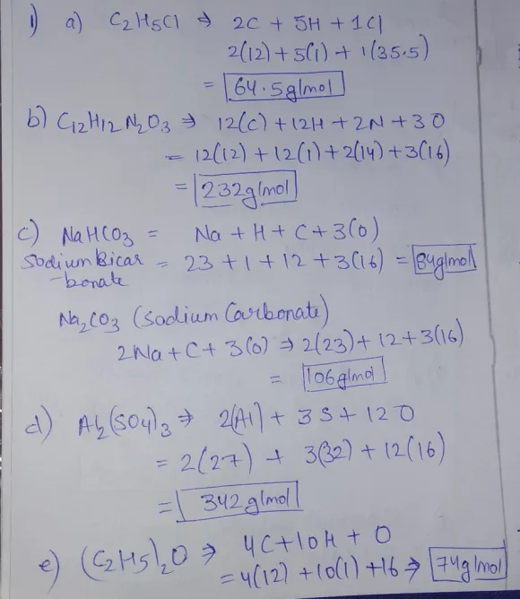 1. Calculate the molar mass of each of the following compounds: a. Ethyl chloride , C2H5CI b. Phenobarbital, C12H12N2O3 C.Sodium carbonate, NaHCO3 d. Aluminum sulfate, Al2(SO4)3 e. Diethyl ether, (C2H5)2 O 2. Calculate the number of molecules in each of the following samples. a. 3.04 mol of C8H18 b. 0.002 mol of aspirin, C9H8O4 3. Calculate the mass of each of the following sample. a 17.2 mol of CO2 b . 0.053 mol of (NH4)3PO4 4. Calculate the number of moles in each of the following samples. a. 3.69 x 10 to the power of 24, atoms of uranium, U b. 7.54 x10 to the power of 23 molecules of H2O c. 76.9 g of BaSO4 d. 146.2 g of C2H5OH 5. under certain circumstances, carbonn dioxide , CO2(g), can be made to react with hydrogen gas.H2(g), to produce methane , CH4(g), and water vapour , H2O(g); CO2(g) +4H2(g)----->CH4(g) +2H2O(g) How many moles of methanes are produced when 71.1 moles of carbon dioxide gas react with excess hydrogen gas?