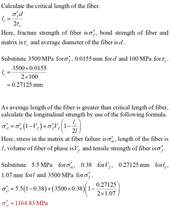 Compute the longitudinal tensile strength of an aligned glass fiber-epoxy matrix composite in which the average fiber diameter and length are 0.0155 mm (0.60 × 10-4 in.) and 1.07 mm (0.042 in.), respectively, and the volume fraction of fibers is 0.38. Assume that (1) the fiber-matrix bond strength is 100 MPa (14,500 psi), (2) the fracture strength of the fibers is 3500 MPa (5 × 105 psi), and (3) the matrix stress at composite failure is 5.5 MPa (800 psi).